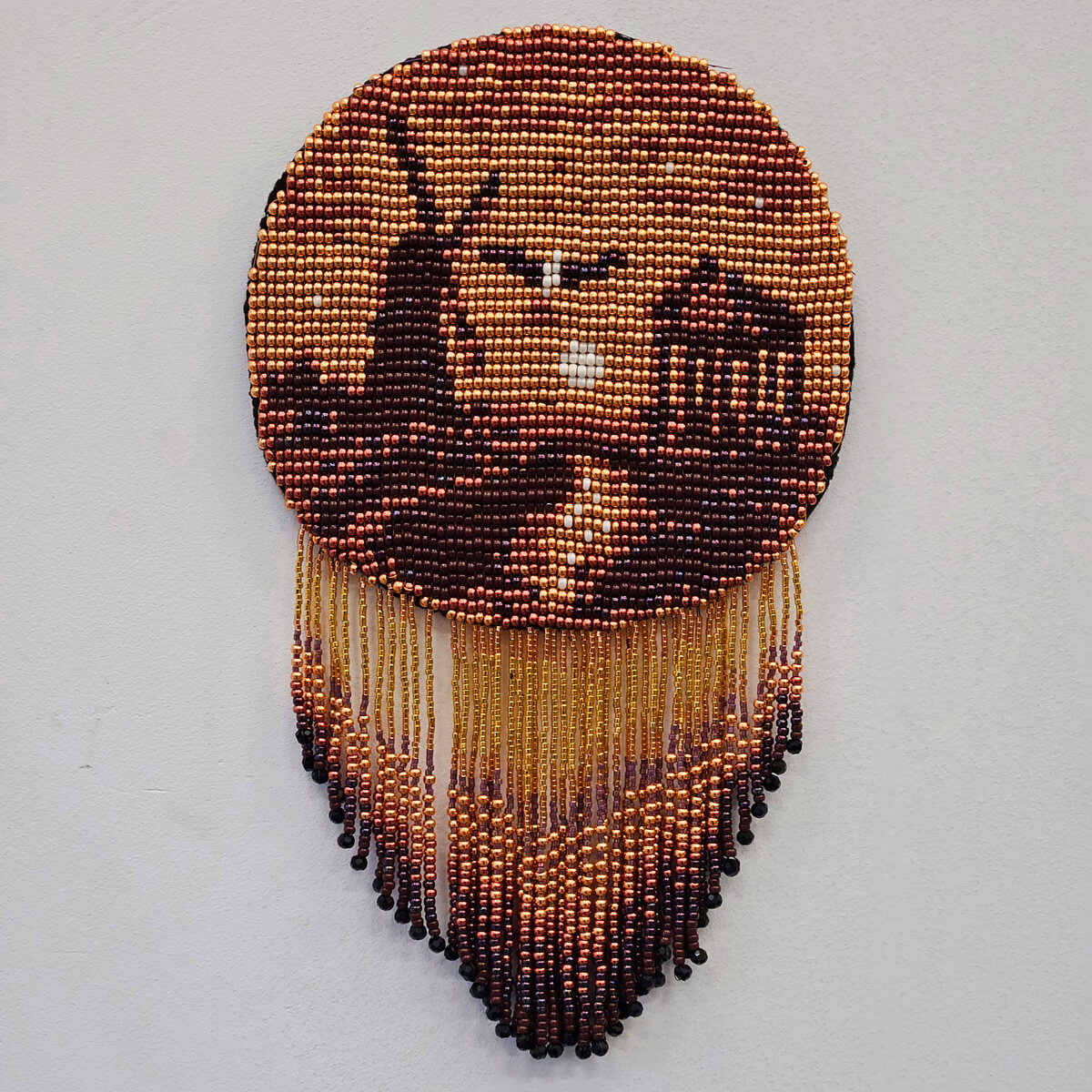 Beadwork made out of glass and metal beads on wooden and aluminum frame, vinyl print on velvet