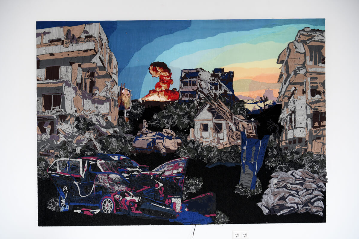 News photo of refugee centre Ter Apel turned into tapestry, made out of tens of thousands donated buttons, all embroidered by hand. 245x285cm. 2023.